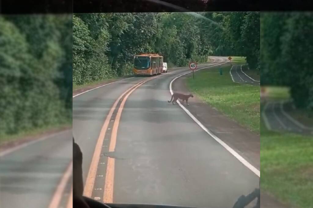 Imagens registradas por visitantes mostram o felino caminhando pelo gramado e, em seguida, parando tranquilamente no meio da rodovia antes de seguir para outra área verde. Em outro registro, a onça aparece novamente andando pela margem da pista até entrar na mata.