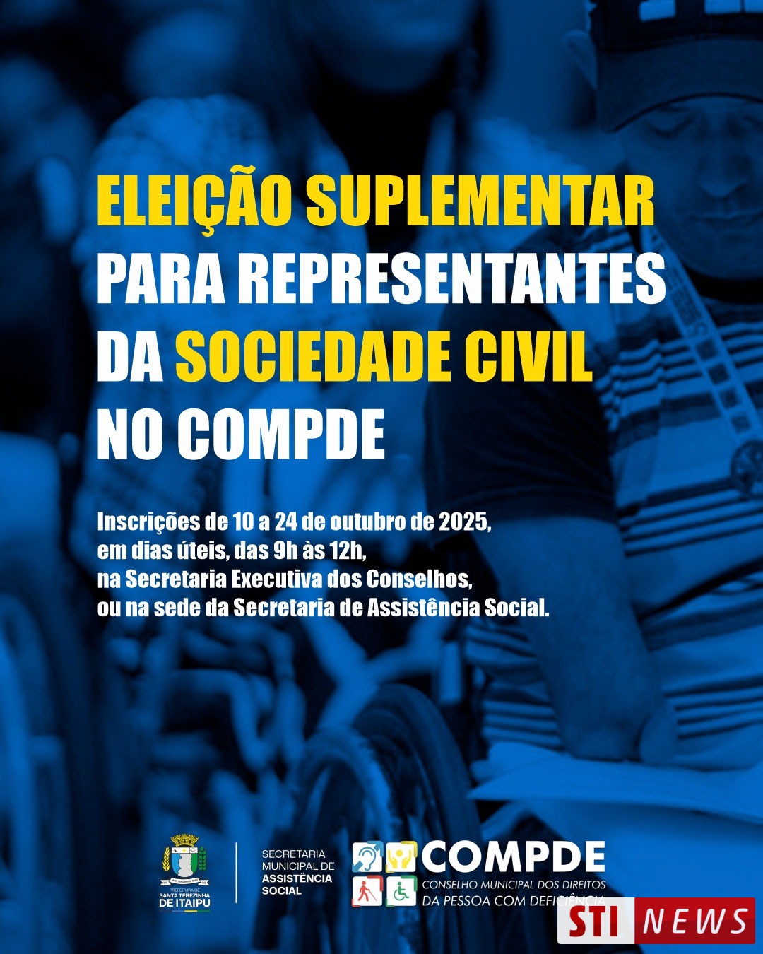 O Conselho Municipal dos Direitos da Pessoa com Deficiência (COMPDE), abriu edital para eleição suplementar de representantes da sociedade civil para o biênio 2025/2027. A escolha ocorrerá no dia 10 de novembro de 2025, das 14h às 16h, durante Assembleia Geral na sala de reuniões da Secretaria Municipal de Assistência Social, localizada na Rua Ângelo Pedro Dotto, nº 610, Centro.